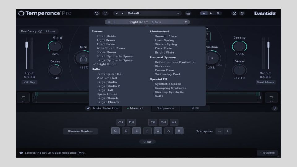 Панель Note Selection — настоящий центр притяжения в Temperance Pro. Режим Manual — самый простой: вы вручную выбираете ноты, которые нужно подчеркнуть. Это можно сделать, просто кликая по нужным ступеням или выбрав интервал, гамму, аккорд или лад из библиотеки плагина. Сначала задаётся тоника слева, затем подбираются ноты, которые будут её поддерживать: любой интервал (тритон, чистая кварта или квинта, любые интервалы из мажорного и минорного лада), набор аккордов (мажорный, минорный, suspended, уменьшённые и их варианты), 12 популярных гамм или один из семи диатонических ладов. Такой подход даёт широкий выбор вариантов настройки реверба под конкретную композицию — от аккуратного звучания точно в строе до более смелых гармоний внутри выбранной тональности.
