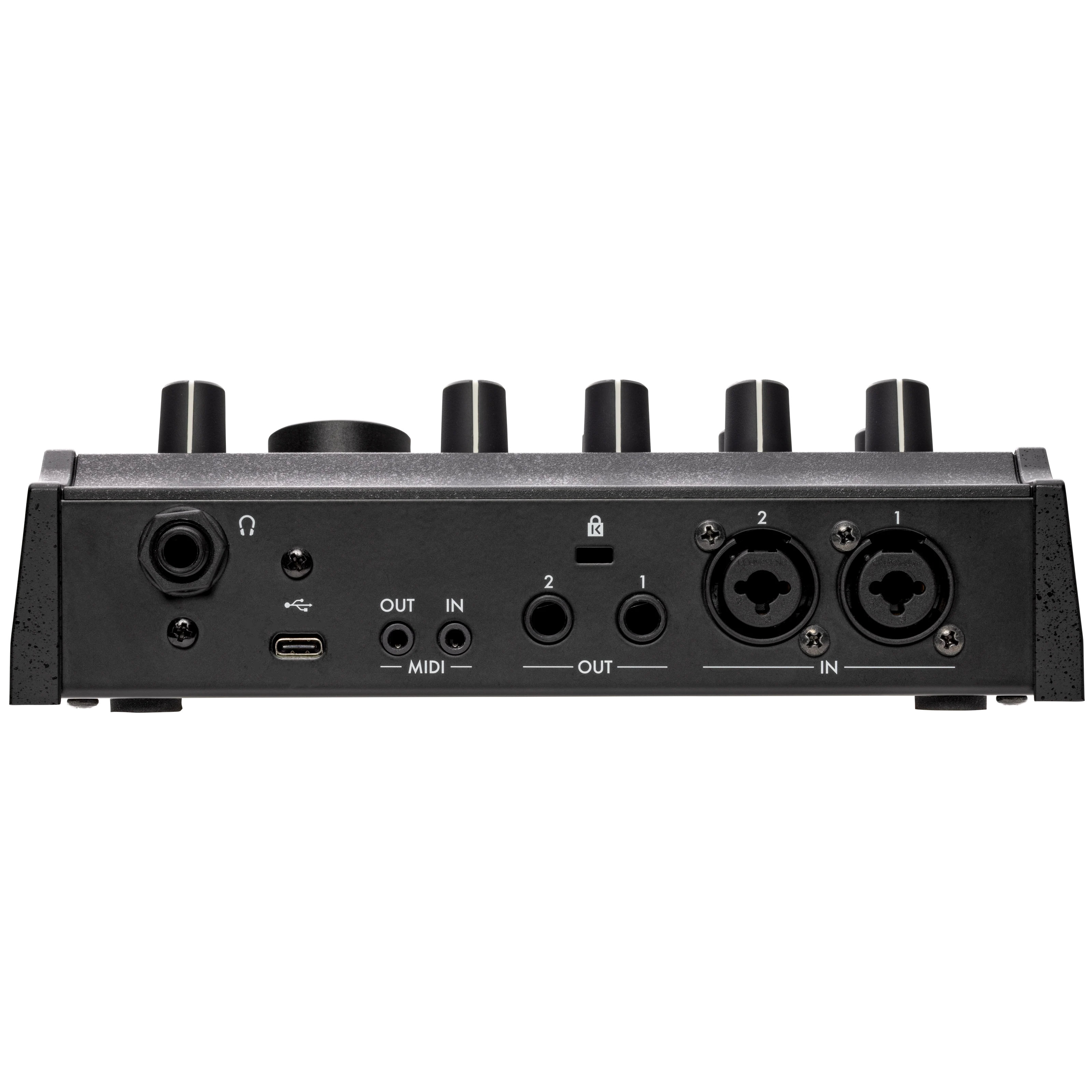 - Разъемы: 2 × комбо-входы XLR / 6.35 мм TRS, 2 × выхода 6.35 мм TRS jack, 1 × выход для наушников 6.35 мм, 1 × порт USB-C