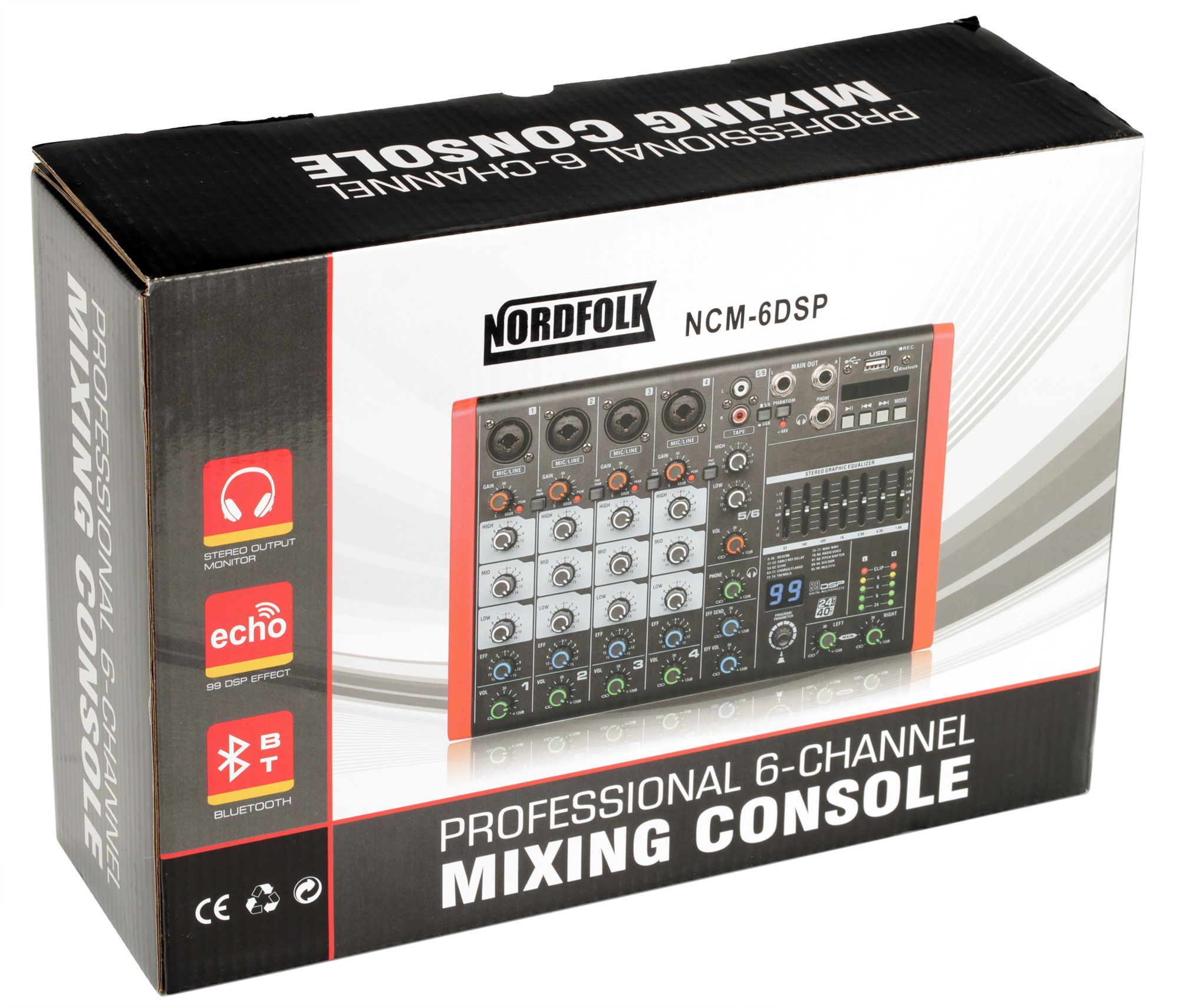 NordFolk NCM-6DSP - компактный 6-канальный микшерный пульт со встроенным процессором эффектов. Подойдет для небольших концертных выступлений, школьных актовых залов, ресторанов и т.п. 4 комбинированных (XLR-Jack) входа со встроенным фантомным питанием 48 В позволяют подключать не только динамические, но и конденсаторные микрофоны. Разъемы Jack можно использовать для подключения гитар, синтезаторов или иных электронных инструментов. Для воспроизведения минусовок имеется 2 RCA входа (L,R). Также присутствует функция MP3-плеера - достаточно подключить флешку во вход USB. Каждый микрофонный канал снабжен встроенным 3-полосным эквалайзером, а на мастер секции расположен 7-полосный эквалайзер. Встроенный DSP-процессор включает в себя 99 мультиэффектов.