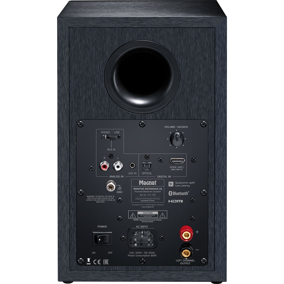 Magnat Monitor Reference 2A - компактная активная полочная акустическая система. Колонки имеют двухполосную конфигурацию и оснащены фазоинвертором, выходное отверстие которого находится на задней панели корпуса. В Magnat Monitor Reference 2A установлен СЧ/НЧ-динамик диаметром 5 дюймов с диффузором из пропитанной бумаги. Он оснащен мощным ферритовым магнитом и способен развить существенное звуковое давление. Твитер в колонках имеет мягкий 25-мм купол и выполнен по фирменной технологии Fmax. Она предусматривает использования подвеса купола увеличенной ширины, что положительно сказывается на равномерности частотной характеристики. Твитер нагружен на рупор-звуковод, который выравнивает диаграмму направленности и повышает детализацию звука. В колонках установлен усилитель с максимальной мощностью 75 Вт на канал. Magnat Monitor Reference 2A оснащены линейным RCA (может быть также переведен в режим Phono-входа для подключения MM-звукоснимателя), дополнительным аналоговым входом на разъеме mini-jack 3,5 мм, оптическим входом. Интересной особенностью модели является наличие HDMI-входа с поддержкой возвратного аудиоканала ARC. Это обеспечивает простое подключение Magnat Monitor Reference 2A к современному телевизору для воспроизведения звукового сопровождения передач, а также аудиосигнала со всех подсоединенных к самому ТВ источников. Завершает список возможностей встроенный приемник Bluetooth с поддержкой улучшенного аудиокодека aptX. Вся электроника и входы находятся в одной колонке стереопары, что упрощает их размещение и подключение.