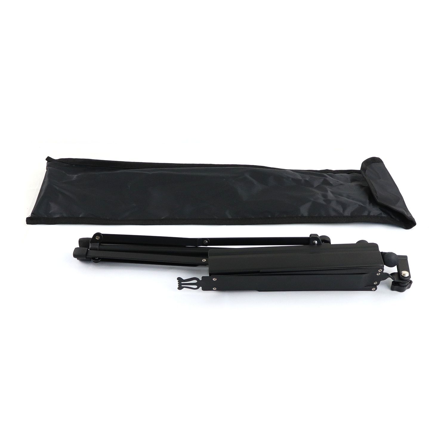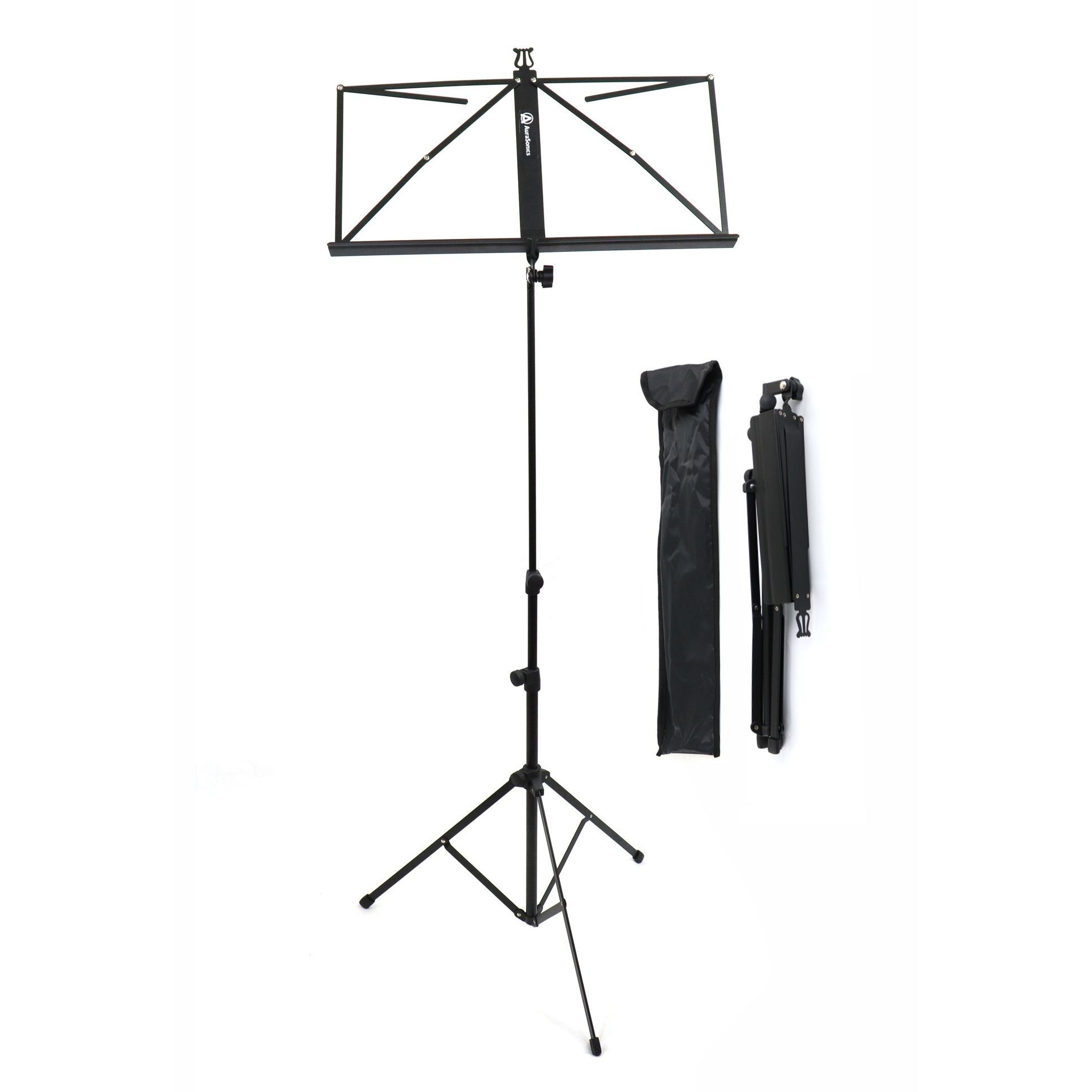 AuraSonics MSS4 - складной пюпитр высотой 700-1400 мм. Подставка для нот оснащена двумя фиксаторами страниц, угол ее наклона можно менять по желанию пользователя. Ножки пюпитра обладают резиновыми наконечниками, за счет чего он не скользит по полу во время работы. Основание в виде треноги добавляет аксессуару еще больше стабильности. Телескопическая стойка из 3 элементов позволяет собрать пюпитр максимально компактно. Поставляется в комплекте с чехлом для переноски.