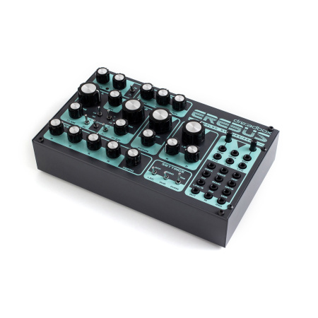 Dreadbox Erebus Re (Reissue) - аналоговый полумодульный парафонический синтезатор с двумя осцилляторами, представляющий улучшенную версию Erebus с обновленными огибающими и возможностью установки в системы Eurorack. Каждый осциллятор имеет две переключаемые формы волны, пилообразная и квадратная для VCO 1, пилообразная и треугольная для VCO 2, а также отдельные параметры глайд. Обновленным дополнением является функция Hard Sync для осцилляторов. За формирование звука отвечает классический низкочастотный фильтр Dreadbox 12 дБ/окт. Две усовершенствованные для повышения производительности и контроля огибающие AR и ADSR направлены на VCA и фильтр соответственно. Эффект Lo-Fi эха завершает цепочку формирования сигнала. Erebus имеет полумодульную конструкцию с 18 патч-точками, что позволяет полностью интегрировать его с Eurorack-синтезаторами. В комплект входит модуль Erebus Eurorack, корпус 42HP, переходник с DIN5 на 3,5 мм и ленточный кабель (для подключения к Eurorack-системам).