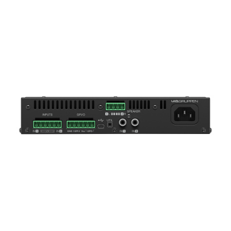 Lab.Gruppen LUCIA 60/2 - трансляционный двухканальный усилитель мощности, представляющий собой младшую модель в линейке LUCIA с микшерной матрицей 2 x 2. Устройство отличается небольшими габаритами, продвинутым и современным интерфейсом, а также доступной стоимостью, за счёт чего может прекрасно проявить себя в различных инсталляциях, от работы в барах, кафе и ресторанах для воспроизведения фоновой музыки. Модель функционирует в классе D и обеспечивает по 30 Вт на канал при нагрузке 2, 4 или 8 Ом, а также 15 Вт/канал при коммутации с акустикой с сопротивлением 16 Ом. Для автоматического определения входного сопротивления имеется функция Auto Load Sense. Частотный диапазон простирается от 5 Гц до 22 кГц. Встроенный DSP-процессор предлагает множество инструментов для обработки, доступных индивидуально для каждого из каналов. Среди них имеются пользовательские пресеты, параметрические эквалайзеры, НЧ-фильтры, многополосные компрессоры и лимитеры. Также присутствует технология оптимизации уровней громкости Automatic Dynamic Loudness Contouring, особенно эффективно работающая со слабыми сигналами в качестве тонкомпенсации. Входная чувствительность при балансном подключении равняется стандартным +4 дБн. Для коммутации с источником звука в наличии есть балансные и небалансные входы, представленные на 3-контактных клеммах Euroblock и разъёмах RCA соответственно. Для вывода аудиосигнала используется небалансный выход на 2-контактном разъёме Euroblock. Порт GPIO предназначен для удаленного управления устройством посредством настенной панели, с помощью которой можно дистанционно переключать каналы и регулировать громкость. Также этот порт служит для возможности работы с интерфейсом RS-232. Для подключения к ПК и редакции функционала DSP-процессора предусмотрен порт Mini USB-B. Среди совместимых операционных систем есть Windows и macOS. Усилитель мощности выполнен в виде прочной стальной конструкции полурэкового формата высотой 1U. Его передняя панель оснащена цветной индикацией работы лимитера и двумя регуляторами громкости для каждого из каналов. Питание осуществляется от сети в соответствии с сертификацией Energy Star для экономии энергоресурсов. Присутствует режим Standby, автоматически включающийся после 20 минут отсутствия входного сигнала. Наконец, имеются технологии защиты от понижения напряжения, перегрева и короткого замыкания, а также интеллектуальная система вентиляции, что в сумме обеспечивает стабильную и эффективную работоспособность в самых разных условиях.
