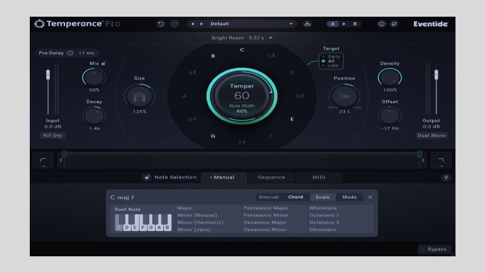 Панель Note Selection — настоящий центр притяжения в Temperance Pro. Режим Manual — самый простой: вы вручную выбираете ноты, которые нужно подчеркнуть. Это можно сделать, просто кликая по нужным ступеням или выбрав интервал, гамму, аккорд или лад из библиотеки плагина. Сначала задаётся тоника слева, затем подбираются ноты, которые будут её поддерживать: любой интервал (тритон, чистая кварта или квинта, любые интервалы из мажорного и минорного лада), набор аккордов (мажорный, минорный, suspended, уменьшённые и их варианты), 12 популярных гамм или один из семи диатонических ладов. Такой подход даёт широкий выбор вариантов настройки реверба под конкретную композицию — от аккуратного звучания точно в строе до более смелых гармоний внутри выбранной тональности.