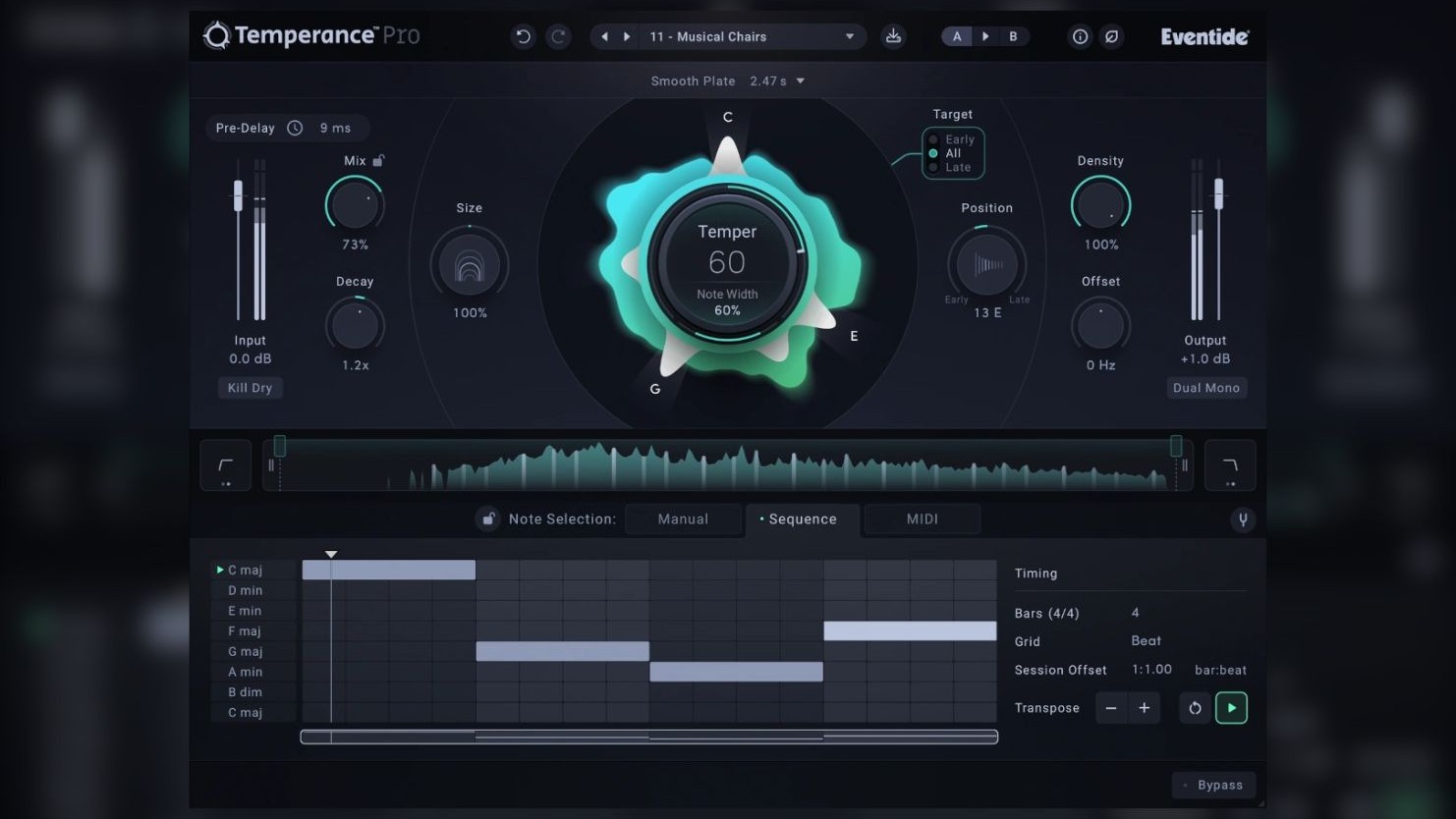 Вместо моделирования пространства только через время и частотный спектр Temperance Pro работает в той же двенадцатитоновой хроматической системе, что и входящий сигнал. Отдельные ноты могут дольше тянуться или, наоборот, быстрее затухать в хвосте реверберации. В результате реверб создаёт отклик, который реагирует на гармоническое содержание сухого сигнала и звучит более музыкально и естественно.