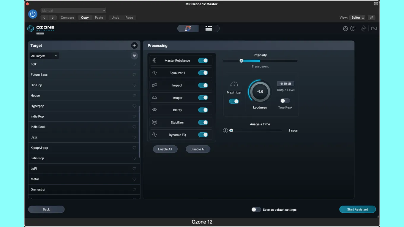Mastering Assistant — популярная функция на базе ИИ. Она анализирует трек и собирает цепочку обработки для улучшения звучания. В Ozone 10 предложения ИИ казались готовым решением, в 11-й — лишь отправной точкой. Теперь в 12-й версии ее можно настраивать: включать или отключать модули, указывать стиль музыки и время прослушивания до минуты.