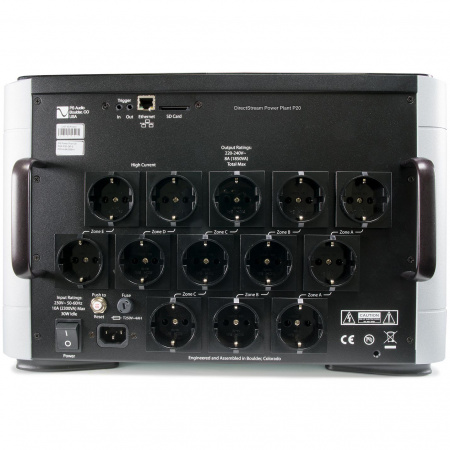 PS Audio DirectStream Power Plant 20 - сетевой регенератор с DSD-генератором и программируемой вентильной матрицей FPGA на 13 розеток. Аппарат способен создать исключительно ровную синусоиду чистого стабилизированного напряжения на выходе, обеспечивая при этом ничтожно малое количество помех и шумов. Устройство использует программируемую вентильную FPGA-матрицу для DSD-источника гармонических колебаний (прецизионный DSD-генератор «синуса») и оснащается высокоэффективной системой мониторинга в режиме реального времени. Предельный пиковый уровень мощности достигает 3,6 кВА, а номинальный рабочий уровень составляет 2 кВА. При этом модель обеспечивает исключительно низкий выходной импеданс. Регенератор помогает повысить динамику и прозрачность звучания, улучшить бас, а также построить широко открытую трехмерную звуковую сцену. Устройство гарантирует более динамичную стабилизацию напряжения по сравнению с фирменными моделями прошлых поколений и мгновенно выдает внушительную чистую мощность с высокими пиковыми токами до семидесяти ампер (до 35 А в версии для продажи в Европе). Для передачи высоких токов используются шины толщиной в шесть миллиметров, изготовленные из очищенной меди, покрытой слоем золота. Точность стабилизации напряжения на выходе составляет 0,1 В. Сетевой фильтр собран в тяжелом массивном металлическом корпусе с полированной верхней панелью, пассивным охлаждением и крупными ручками, закрепленными на фасаде. На фронтальной панели имеется цветной сенсорный LCD-дисплей, который может работать в разных режимах. На дисплее отображается индикатор потребляемой мощности, показатель коэффициента нелинейных искажений (THD) на входе и выходе, осциллограф и др. Европейская версия модели оснащена тринадцатью высококачественными розетками Schuko, триггерными входом и выходом, разъемом Ethernet для управления через веб-интерфейс и слотом для SD-карт (карты используются для обновления прошивки). В комплект входит пульт дистанционного управления.