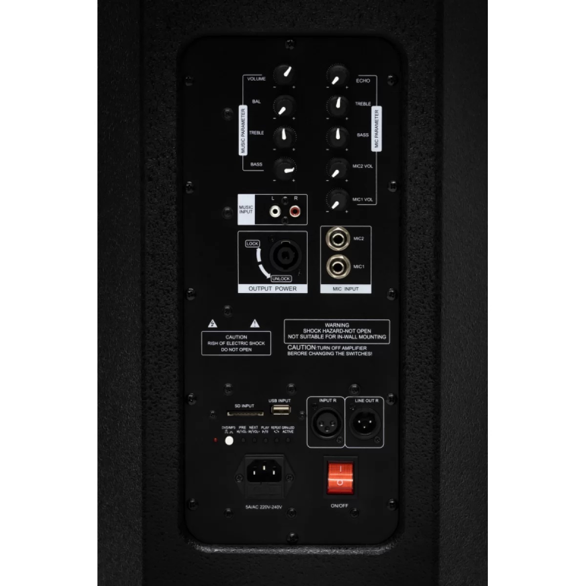 Elarcon PRX625A - это активная 2-полосная акустическая система. За качественное и полноценное звучание отвечает пара 15-дюймовых динамиков и 1.5-дюймовый твитер. Они озвучивают частотный диапазон от 40 Гц до 19.5 кГц при уровне -10 дБ. Дисперсия 90 на 50 градусов обеспечивает широкую зону звукового покрытия. Усилитель класса D формирует максимальную выходную мощность 1500 Вт, а уровень пикового звукового давления может достигать 139 дБ. Встроенный DSP-процессор контролирует работу кроссовера и динамического лимитера, обеспечивая чистый звук без искажений и перегрузки. Для подключенного источника аудиосигнала и внешнего микрофона есть раздельные 2-полосные эквалайзеры. Для микрофонного канала также имеется эффект эхо. Колонка также отличается встроенным медиаплеером, который оснащен слотом для SD-карты и портом USB-A для флеш-карты. Для подключения источника звука есть вход на разъеме XLR и стереофонический вход на коннекторах RCA. Сквозной выход также представлен разъемом XLR. Для опционального микрофона предусмотрено 2 входа на разъемах 1/4'' Jack TS. Корпус выполнен из березовой фанеры толщиной 18 мм и оснащен точками для подвеса с резьбой M10 и рукоятками для удобной транспортировки.
