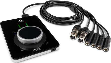 Apogee Duet 3 - портативный USB-C аудиоинтерфейс, обновленная версия модели Duet. От предыдущей модели Duet 2 данная версия отличается более компактными размерами с измененным дизайном корпуса, а также наличием DSP-процессора и 2 дополнительными входами. Интерфейс оснащен одними из лучших в своем классе чипами и обладает двумя качественными предусилителями с усилением до 65 дБ. Для управления устройством предусмотрен один многофункциональный регулятор, который позволяет изменять общую громкость, а также усиление преампов. Модель оснащена разъемами 2 USB-C, один из которых предназначен для подключения к ПК, а второй - для случаев, когда предпочтительно использовать питание от другого источника. Также аудиокарта снабжена выходом для наушников и специальным разъемом с переходником на 2 инструментальных TRS входа, 2 XLR входа и 2 TRS выхода. Duet 3 имеет DSP-процессор, благодаря которому возможно задействовать фирменные плагины Apogee в режиме минимальной звуковой задержки без использования ресурсов ПК. Программное обеспечение Apogee Control, поставляемое с интерфейсом, позволяет управлять громкостью и панорамой каналов, включать фантомное питание, активировать mono / stereo и mute / solo режимы, а также подключать к каналам эффекты. Apogee Duet 3 поддерживает работу в операционных системах Mac и Windows. В комплект также входит кабель с разъемами, кейс, кабель USB-C/USB-A, плагины Apogee Channel FX и скидка 50% на покупку Symphony ECS Channel Strip.