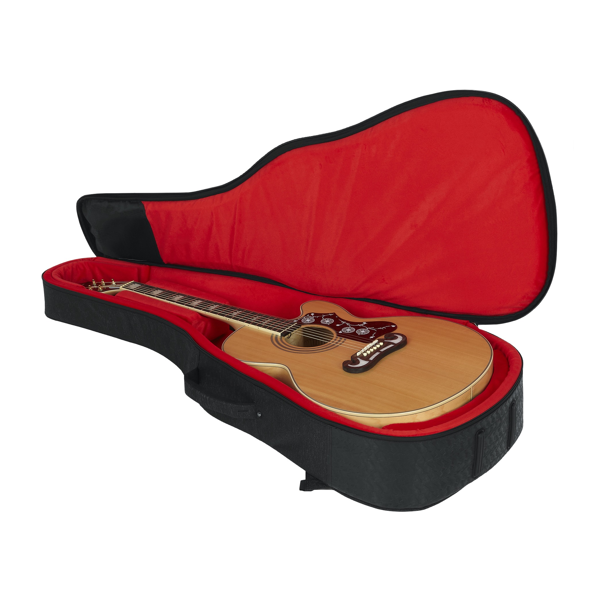 Gator GT-JUMBO - чехол для акустической гитары Jumbo. Этот чехол разработан специально для акустических гитар типа Jumbo, обеспечивая высочайший уровень защиты и комфорта при транспортировке. Внешнее влагостойкое покрытие и толстый 20-мм слой защитной пены внутри создают "кейсовую" защиту для вашего инструмента. Съемная система внутренних пенных блоков надежно фиксирует гриф, головку и основание гитары. Складные лямки убираются в специальный карман на молнии. Усиленная ручка для переноски обеспечивает надежный хват, а D-образные кольца позволяют прикреплять дополнительные аксессуары. Большой внешний карман с пряжкой G-Hook предназначен для хранения кабелей, тюнера и других аксессуаров. Толстая резиновая прокладка на дне чехла предотвращает износ и защищает инструмент от влаги, грязи и небольших повреждений.