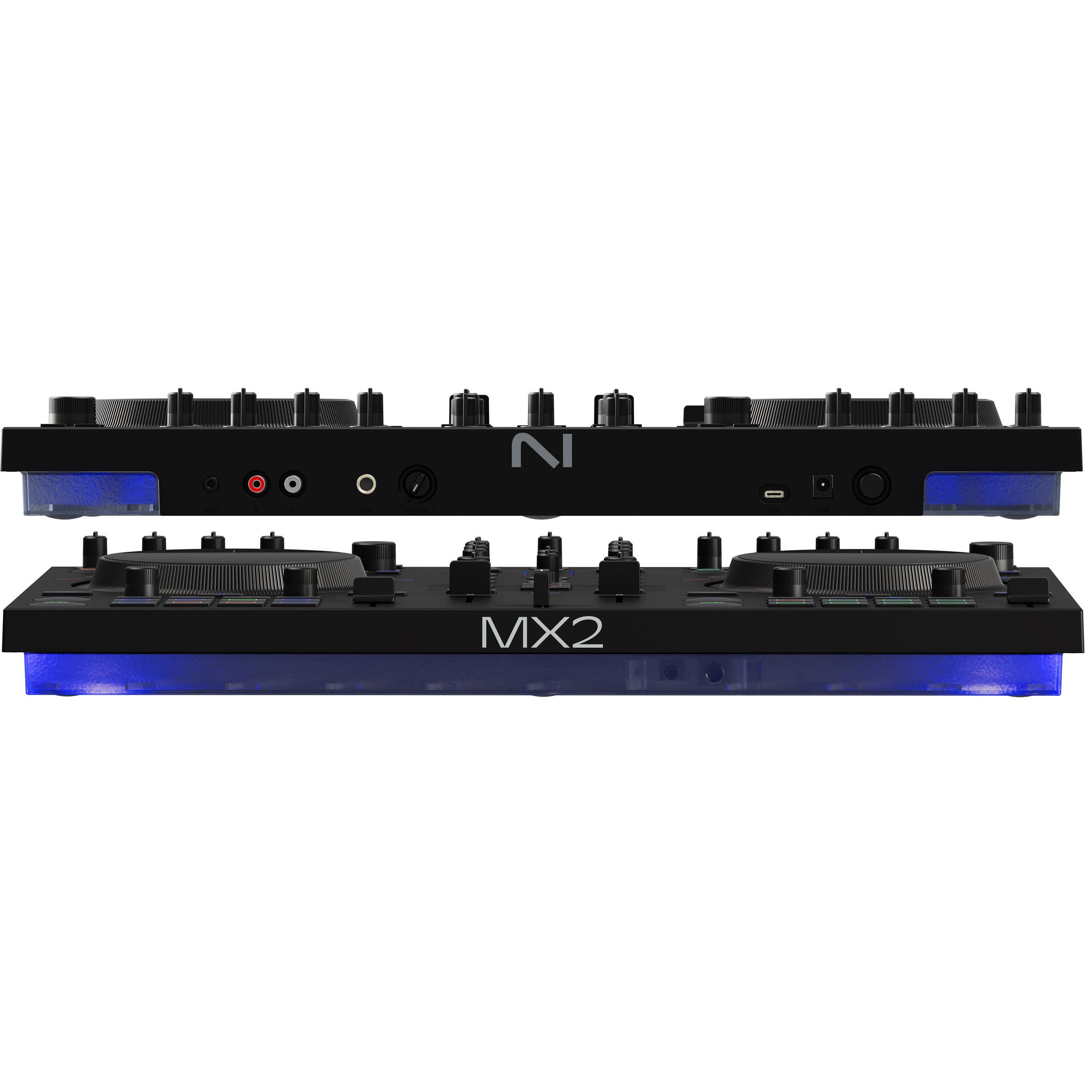 Native Instruments Traktor MX2 — двухканальный DJ-контроллер с аудиоинтерфейсом 24 бит / 96 кГц, предназначенный для работы с Traktor Pro 4 (поставляется в комплекте). Контроллер оснащён двумя сенсорными jog-колёсами с режимами Turntable и Jog, двумя фейдерами, кроссфейдером, 3-полосным эквалайзером на каждом канале и визуальными VU-метрами. MX2 позволяет управлять до 16 эффектами, включая полный набор Mixer FX и Deck FX, с доступом к 40+ студийным эффектам Native Instruments. Контроллер имеет 16 RGB перформанс-пэдов с четырьмя режимами (Hotcues, Stems, Flux Loops, Pattern Player), шесть энкодеров и 21 потенциометр. В режиме Pattern Player перформанс-пэды превращаются в пошаговый секвенсор, позволяя создавать живые ритмические паттерны и накладывать их поверх треков. Аудиоинтерфейс предоставляет мастер-выходы RCA и мини-джек 1/8", выходы на наушники 1/8" и 1/4", микрофонный вход 1/4", а также USB-C для подключения к компьютеру. Питание осуществляется через USB или внешний адаптер. MX2 поддерживает синхронизацию по MIDI clock, подсветка кнопок и нижней панели позволяет интуитивно ориентироваться в затемнённом помещении. Контроллер совместим с macOS 12–15 и Windows 10–11, минимальные требования — 4 ГБ ОЗУ и процессор Intel Core i5 или аналогичный.