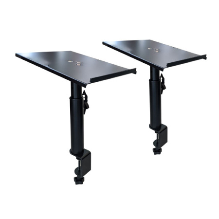 NordFolk NPS056 - пара настольных стоек для студийных мониторов с креплением к столу. Комплект позволяет удобно и компактно расположить мониторы в небольшом пространстве. Стойки имеют регулируемую высоту: от 265 до 300 мм и угол наклона от 0 до 12°. Прочные надежные стойки выполнены из стали. Полка под монитор с ограничителем и демпферной накладкой имеет размеры 230 х 300 мм. Усиленная струбцина крепления позволяет выдерживать нагрузку до 27 кг.