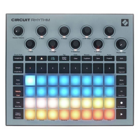 Novation Circuit Rhythm - автономный грувбокс и универсальный семплер, созданный специально для битмейкеров. Располагает восемью каналами и встроенными эффектами. Управление и программирование партий происходит при помощи 32 пэдов RGB, чувствительных к силе нажатия, а управление параметрами и редактирование семплов - с помощью десяти ручек.