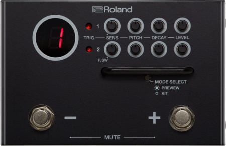 Roland TM-1 - компактный триггерный модуль для электронной ударной установки. Модуль позволяет расширить диапазон имеющихся в распоряжении звуков акустической установки ударных. Причем звуки могут быть абсолютно разными, начиная с "бортовых" сэмплов ТМ-1, таких как бас-барабан, малый барабан, томы, тарелки и перкуссия, и заканчивая записанными самостоятельно сэмплами и лупами. Достаточно просто подключить к ТМ-1 любой триггерный пэд компании Roland — и все необходимые звуки в вашем распоряжении. Или же можно установить триггер серии RT на один из акустических барабанов и накладывать звук сэмпла поверх акустического инструмента. Управлять ТМ-1, который предусматривает подачу питания как от батареек, так и от сети, можно с помощью ноги, используя для этого встроенные переключатели. Можно даже мьютировать гибридный звук, нажав на переключатель ногой, чтобы, например, отыграть куплет на чистой акустике, а в припев добавить мощный гибридный звук. Модель имеет 15 встроенных наборов ударных с практически неограниченными возможностями настройки с помощью удобного в использовании программного приложения-редактора. Редактор TM-1 Editor (Mac/Windows, iOS/Android) обеспечивает доступ к более чем 150 дополнительным звукам, а также функциям импорта пользовательских сэмплов и другим. Доступно подключение до двух пэдов или триггеров (два однотриггерных устройства или одно двухтриггерное), а также конвертация триггерного сигнала в формат MIDI при подключении к компьютеру. Имеется порт USB для связи с программным приложением и конвертации триггерного сигнала в формат MIDI.