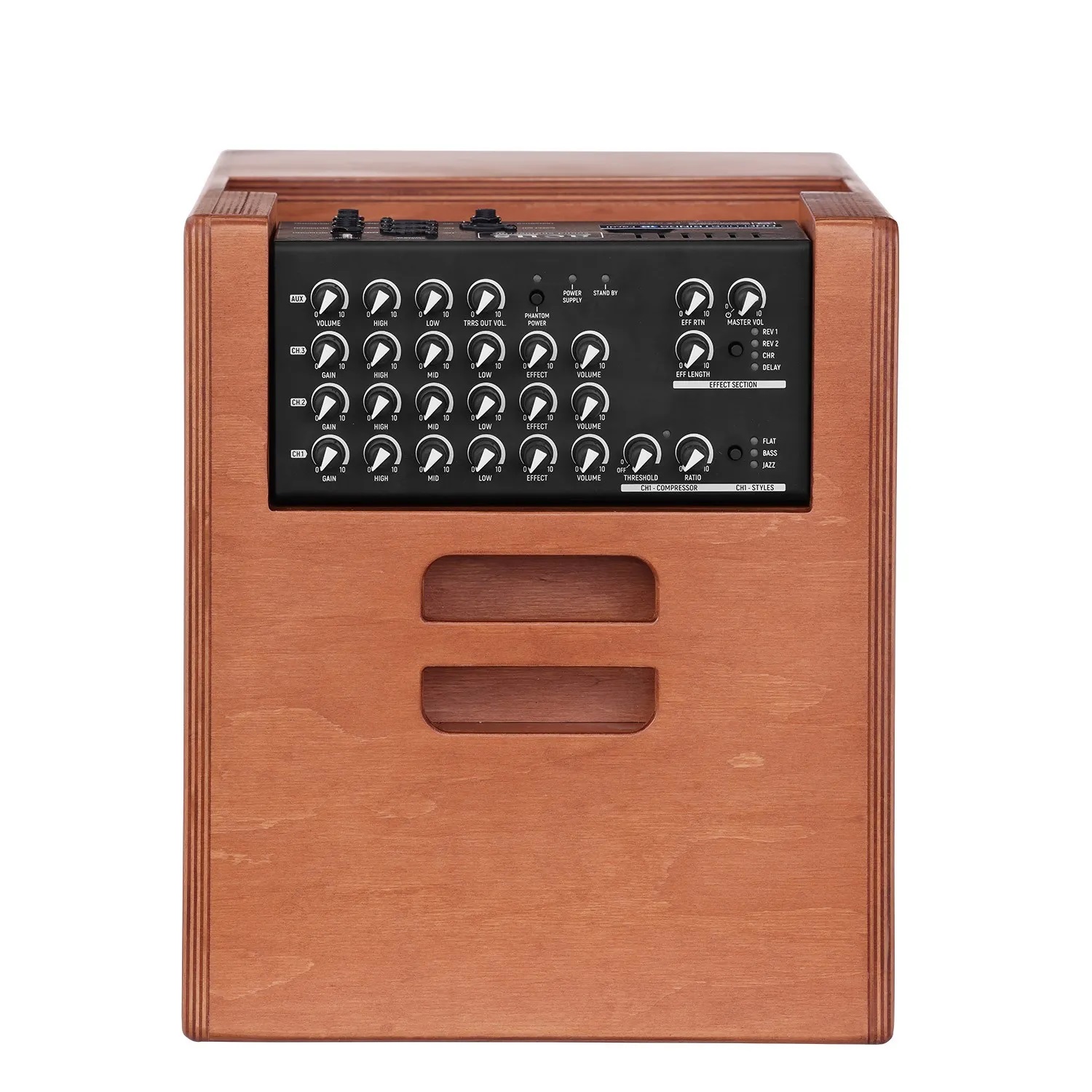 Acus One ForStrings 10 Ferdi - 3-канальный комбоусилитель для акустической гитары мощностью 250 Вт. Это комбоусилитель с тремя независимыми каналами, каждый из которых можно использовать как инструментальный или микрофонный (фантомное питание включается/выключается глобально на всех микрофонных входах.). Все каналы имеют независимые настройки гейна, громкости, уровня эффекта и 3-полосный эквалайзер. Дополнительно к этому Канал 1 имеет встроенный компрессор с регулировкой порога и степени компрессии, а также переключатель характеристики эквалайзера: 1. Flat: Стандартная характеристика для акустических и классических струнных инструментов. В этом режиме также работают Каналы 2 и 3. 2. Bass: Режим для работы с инструментами, обладающими глубоким диапазоном низких частот. В первую очередь это электрические и акустические бас-гитары и контрабасы. 3. Jazz: Адаптирует звучание для работы с магнитными звукоснимателями, в т.ч. для подключения электрогитар, в частности джазовых «банок» и «полуакустик». Встроенная секция эффектов дает на выбор: два типа ревербератора, хорус и дилей. Время задержки и уровень возврата эффекта регулируются глобально, посыл – индивидуально на каждом канале. Так же в секции эффектов находится регулировка мастер-громкости. Дополнительно к трем каналам имеется канал AUX для подключения внешних аудиоустройств. Сигнал поступает от Bluetooth адаптера (в комплекте) или через TRRS вход. Канал AUX имеет независимую настройку громкости, двухполосный эквалайзер и регулировку выходной громкости TRRS, необходимую когда подключение используется для стриминга. Благодаря всей перечисленной функциональности ForStrings 10 Ferdi может с успехом использоваться музыкантами самых различных жанров и специализаций, в том числе и в качестве средства для подзвучки выступления небольшого коллектива.