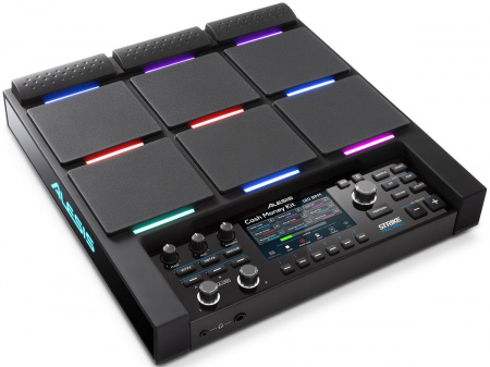 Alesis Strike Multipad - перкуссионный модуль-контроллер с сэмплером и лупером. Устройство оснащено 9 чувствительными к скорости и нажатию пэдами с RGB подсветкой, поворотными назначаемыми энкодерами и дисплеем. Модуль можно использовать в качестве семплера - есть возможность загрузки и записи звуков с внешних источников. Для хранения семплов контроллер имеет 32 ГБ встроенной памяти с набором из 8000 уже записанных звуков. Семплы также можно загружать через USB порт, либо записывать с внешнего микрофона. Также прибор оснащен функцией Loop Recoder для создания звуковых петель, набором эффектов обработки и встроенным аудиоинтерфейсом. Доступны 3 набора эффектов, 1 мастер-эффект, компрессор и эквалайзер, элементы управления эффектами назначаются на два поворотных бесконечных регулятора. Для коммутации устройства предусмотрены: USB, вход MIDI Audio, MIDI In/Out/Thru, Main Out L/R, AUX L/R, Record L/R, 4 тригерных входа TRS, 2 входа для подключения педалей, два выхода для наушников. В комплекте также поставляется ПО Pro Tools First и Ableton Live.