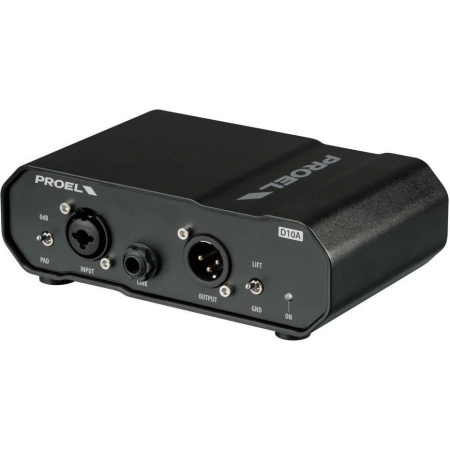 Proel D10A - активный директ-бокс с трансформатором, для работы которого требуется фантомное питание. Преимуществом трансформатора является возможность избежать какого-либо электрического соединения между источником звука и микшером. Это дает два огромных плюса: при отсутствии электрического пути устраняются контуры заземления и возможно подавление синфазных шумов, таких как жужжание. Преимущество активного DI-BOX перед пассивным заключается в нулевых вносимых потерях и меньших шумах на выходе.