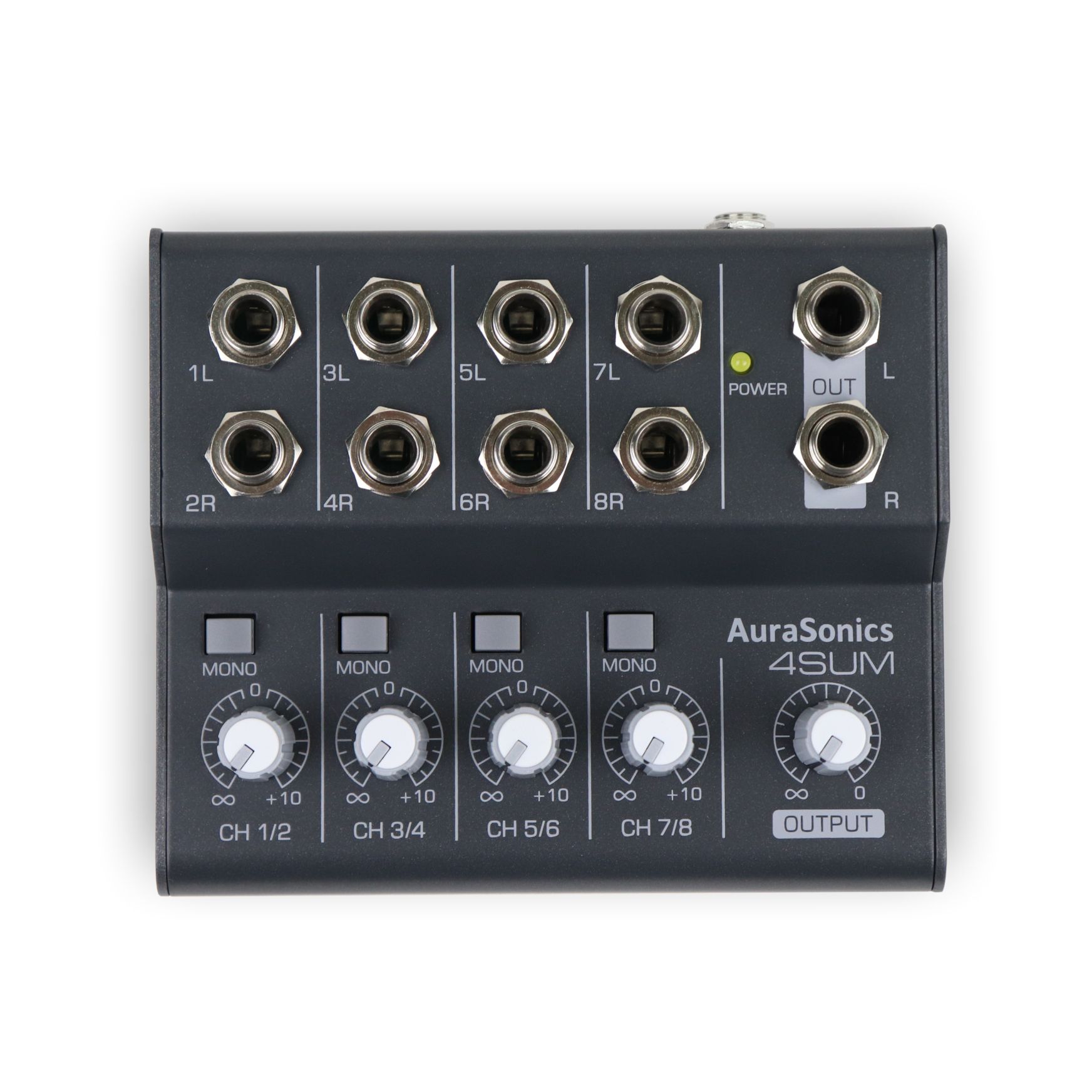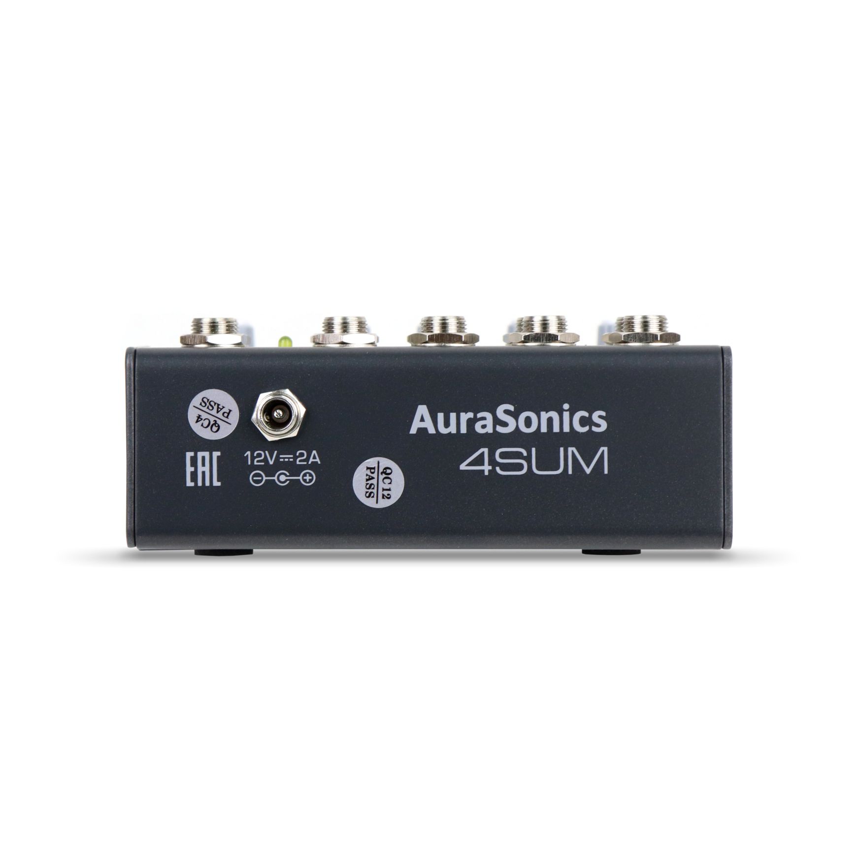 AuraSonics 4SUM - компактный 4-канальный микшер-сумматор. Предназначен для объединения до 4 стерео сигналов или 8 моно сигналов. Каждый канал оснащен регулятором уровня и кнопкой монофонизации для работы с монофоническими сигналами. Входы и выходы выполнены по полностью балансной схеме, снижающей помехи на кабельных линиях. В сигнальных каскадах используются операционные усилители OPA1678 на полевых транзисторах с ультранизким уровнем гармонических искажений. Для увеличения числа источников несколько устройств могут быть включены последовательно. Модель оснащена металлическим корпусом.