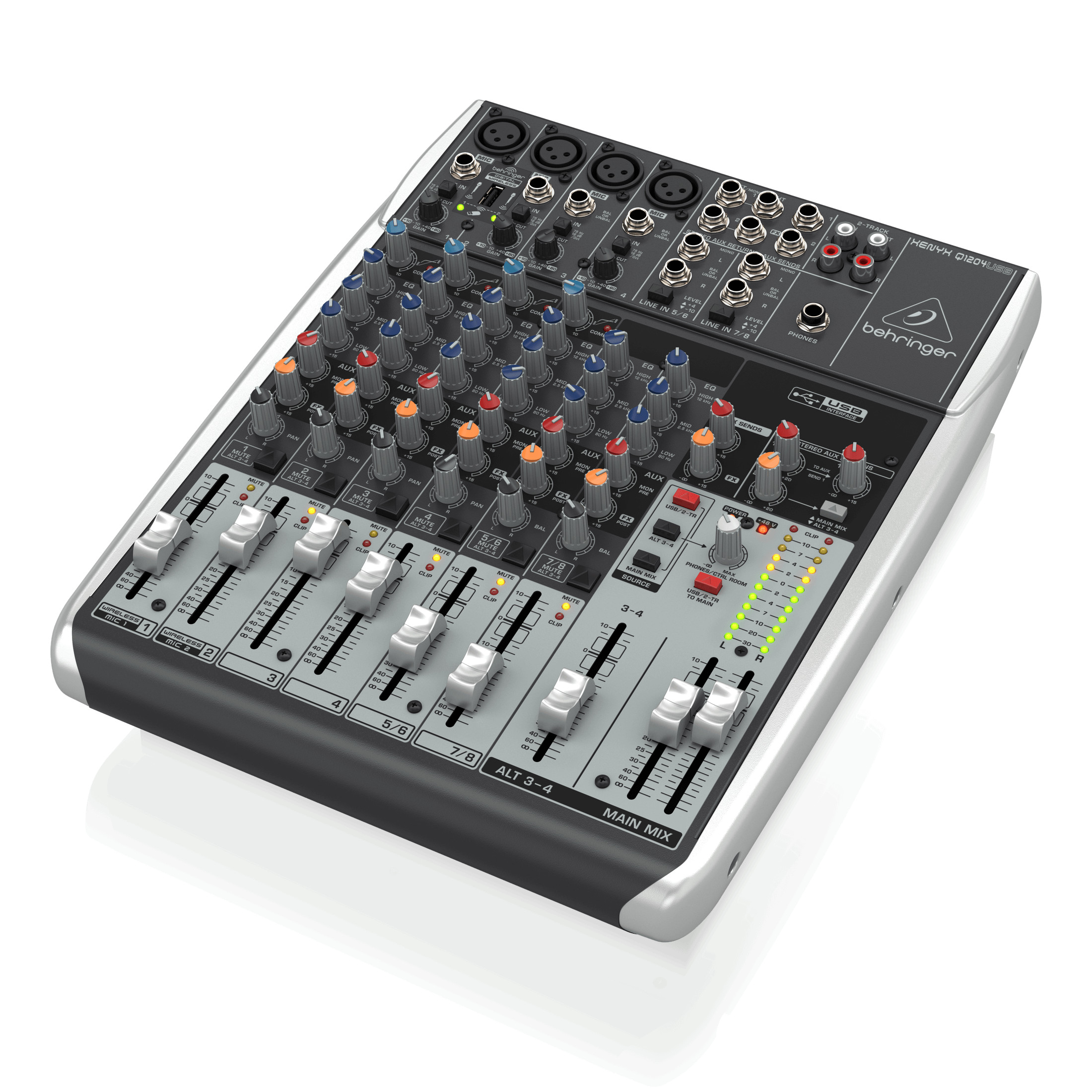 Behringer XENYX Q1204USB – профессиональный студийный 12-канальный аналоговый микшер с 4 малошумящими микрофонными предусилителями XENYX. Позволяет использовать как динамические, так и конденсаторные микрофоны. На 8 входах находятся трехполосные «британские» эквалайзеры, на 4 микрофонных – обрезные НЧ-фильтры, а также компрессоры в виде четырех поворотных ручек со светодиодами. У устройства две шины: можно собрать сигналы с одного или нескольких каналов на любую из них. Имеется возможность беспроводного соединения с ULM-микрофонами Behringer, для чего на фронтальной панели предусмотрен разъем типа USB-A. К нему можно подключить USB-ресивер, к которому можно подсоединить до двух микрофонов. Кроме того, есть встроенный USB-аудиоинтерфейс с подключением к компьютеру. Доступно два посыла на каждый канал: один для мониторинговых приложений, второй – постфейдерный для внешних процессоров эффектов. Всего на борту находится 4 микрофонных входа XLR, 4 линейных моновхода, 2 линейных двухканальных стереовхода и 2 RCA-входа. Выходы представлены разъемами 1/4" TRS Jack на наушники, двумя линейными мастер-выходами на XLR, двумя контрольными TS-выходами, а также двумя RCA-выходами. У каналов есть собственные регуляторы уровня в виде фейдеров с гейном до +10 дБ, ручки настройки баланса и FX post, а на стереофонических каналах можно найти переключатели входной чувствительности +4/-10 дБ. В основной секции находятся общие ручки посыла и возврата, мастер-фейдеры (отдельно на левый и правый канал), регулятор уровня звука в наушниках и на контрольном выходе, индикатор активности фантомного питания, 12-сегментный общий двухканальный индикатор уровня со светодиодом клиппирования и кнопки посыла на запись и в основной канал.
