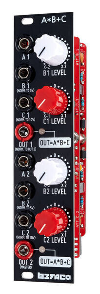 Befaco A*B+C - Eurorack-модуль, двойной четырехквадрантный множитель со смещением VC. Модуль может действовать как двойной ринг-модулятор, двойной VCA и четырехканальный микшер. Каждая секция может выполнять аналоговое умножение двух сигналов (A и B) и добавлять смещение (C). Модуль имеет двухканальные биполярные VCA, регулируемое смещение VC для каждого канала, а также возможности AM и кольцевой модуляции. Нормализация вывода позволяет ему работать в качестве четырехканального микшера.