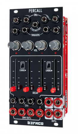 Befaco Percall - Eurorack-модуль, который преобразует четыре разных источника звука в перкуссионные звуки. Модуль имеет 4 канала, каждый с VCA, огибающей затухания и регулятором громкости. Для каждого канала доступен аудиовход, вход триггера, вход Decay CV, выход сигнала огибающей, также имеется аудиовыход для каждого канала (работает как 4-канальный микшер). Percall имеет четыре VCA со специальными огибающими затухания и микшер, так что вы можете подготовить перкуссионный сабмикс. Дополнительный вход strength придаст большую динамику звукам. Аудиовходы нормализованы от одного до двух и от трех до четырех. Это позволяет создавать открытые и закрытые хэты или басовые линии с сайдчейном.