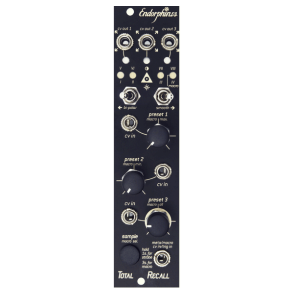 Endorphin.es Total Recall - Eurorack-модуль, многоступенчатый макроконтроллер, 3 x CV пресет-менеджер. Модуль предназначен для облегчения переходов в живых выступлениях, управляя 3 CV одновременно. Интуитивно понятная установка желаемых напряжений для управления чем угодно в вашей модульной системе, которая принимает CV (однополярный 0-5 В или биполярный -5- + 5 В).