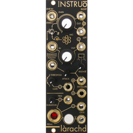 Instruo Larachd - многофункциональный служебный Eurorack-модуль, который обеспечивает различные методы преобразования внешних сигналов и взаимодействий в полезные для музыки сигналы управляющего напряжения. Он имеет преобразователь линейного стереофонического уровня в двойной мономодульный преобразователь уровня, конденсаторный микрофон, усилитель звука, повторитель огибающей, пороговый компаратор и интерфейс с двумя ножными переключателями (включая ножной переключатель). Независимо от того, хотите ли вы обрабатывать сигналы линейного уровня с помощью своих модульных эффектов, управлять своими процессорами, такими как фильтры и VCA, с помощью акустических сигналов или записывать в режиме громкой связи на Arbhar или Lubadh, Larachd — это универсальное решение для вас .