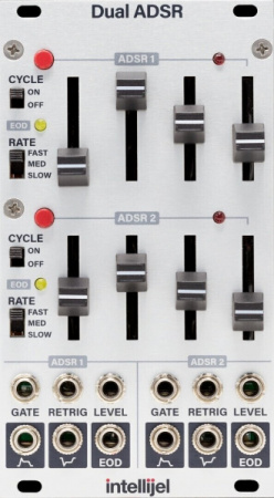 Intellijel Dual ADSR 3U - Eurorack-модуль, двойной ADSR. Intellijel предпочитают слайдеры для генераторов огибающих, потому что они обеспечивают четкое визуальное представление формы модуляции. Эта схема частично основана на конструкции Roland SH-101 / System 100m с некоторыми улучшениями. Intellijel Dual ADSR - это быстрые, классические аналоговые огибающие с интуитивно понятными элементами управления. Добавьте триггерные кнопки, цикличность и различные выходы управляющего напряжения, а затем удвойте их.