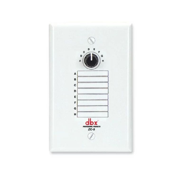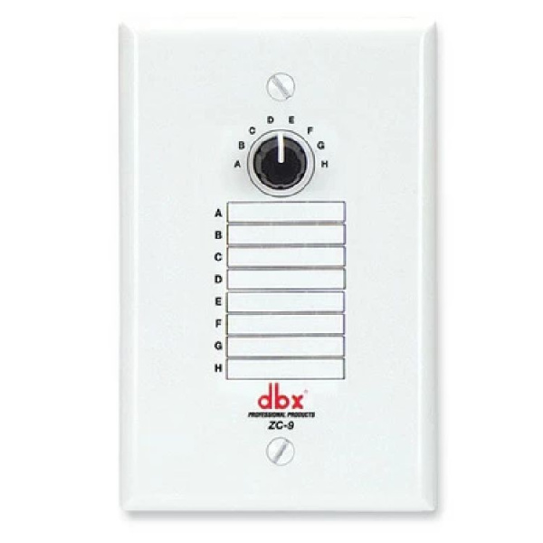 DBX ZC9 - настенный 8-позиционный селектор источника сигнала для ZonePro 1260/1261. Контроллер DBX ZC-9 представляет собой настенный программируемый селектор регулятора громкости. Контроллер имеет два 2 RJ-45 разъёма. Селектор можно подключать как последовательно, так и параллельно. При параллельном подключении длина кабеля равняется 300 м к каждому пульту, а при последовательном общая длина составляет 300 м. В случае возникновения пожароопасной ситуации срабатывает интерфейс замыкания контактов. Контроллер имеет программируемые переключатель выбора зон и выбор источника.