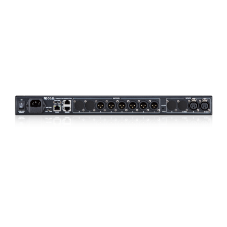 - Задняя панель (1+1) гнездовые разъемы XLR (2 аналоговых входа или 1 AES/EBU), 6 штекерных разъемов XLR (выход), 1 разъем RJ45 для RS485 (вход), 1 разъем RJ45 для RS485 (выход), 1 разъем RJ45 разъем для TCP-IP, 1 x тумблер Ground-lift, 1 x аналоговый/цифровой тумблер, разъем IEC C13 16A; Выключатель питания