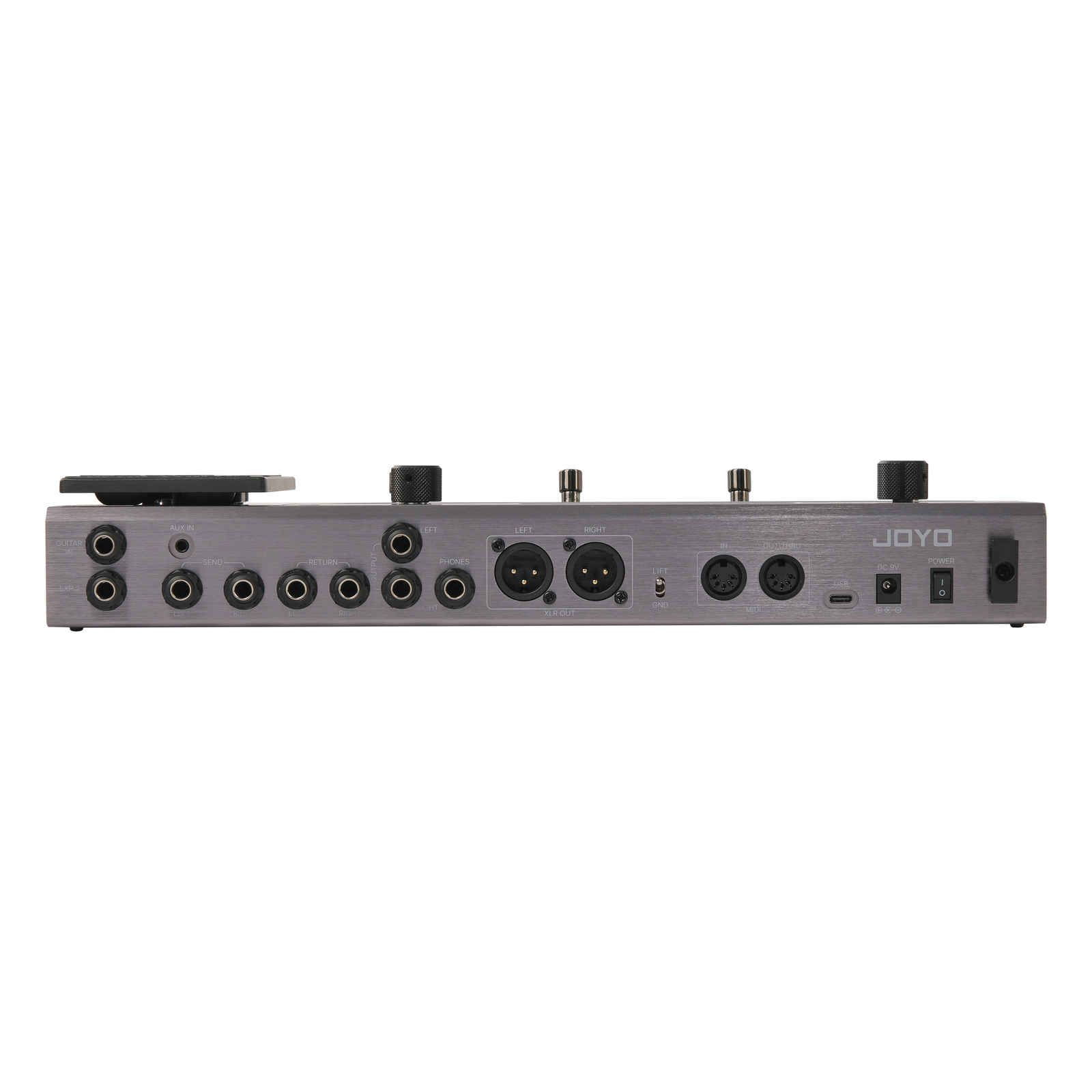 - Подключения: гитарный вход 6,3 мм, стерео FX‑loop, AUX‑in 3,5 мм, выходы: линейные 2 x 6,3 мм, XLR стерео, наушники 6,3 мм, MIDI I/O, USB‑C OTG, разъём педали экспрессии