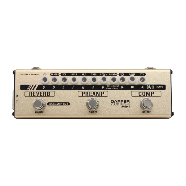 Valeton Dapper Acoustic Mini MES-4 – напольная компактная гитарная педаль мульти-эффектов для акустической гитары. Устройство сочетает в себе тюнер, компрессор, 3-полосный эквалайзер с фильтром обратной связи и ревербератор, заключенные в прочный металлический корпус, обеспечивающий долговечность при активной эксплуатации. Тюнер активируется длительным нажатием кнопки реверберации и автоматически отключает звук при настройке. Модуль Comp предлагает классический компрессор с регулировками степени компрессии (Comp) и скорости атаки (ATK), а также общим уровнем сигнала (Volume), что позволяет добиться плотного и выразительного звука за счет лучшего контроля динамики. Секция предусилителя с 3-полосным эквалайзером (Bass, Mid, Treble) и подавителем обратной связи (Notch с регулировкой частоты) позволяет точно настроить звучание инструмента под любые акустические условия. Ревербератор с одной ручкой управления создает естественное пространственное звучание с плавным затуханием, добавляя глубину вашему исполнению. Для подключения к звукорежиссерскому оборудованию предусмотрен балансный XLR-выход. Выход на наушники (mini-jack TRS 1/8") со встроенным регулятором громкости идеален для репетиций. Для подключения инструмента сзади есть вход Jack TS 1/4". Выход также представлен разъемом Jack TS 1/4". Важно отметить, что у MES-4 надежные ножные переключатели, благодаря чему он сможет хорошо себя показать в долгосрочной перспективе. Получает питание данная модель от адаптера DC 9 Вольт, минус в центре (приобретается отдельно).