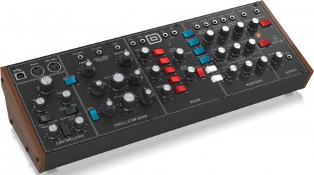 Behringer Model D - аналоговый монофонический синтезатор. Разработка данного синтезатора была основана на легендарном Minimoog Model D и, по заверениям разработчиков, является репродукцией оригинала с подобранными транзисторами. Behringer D обладает полностью аналоговым трактом, оснащен тремя осцилляторами с 6-ю формами волн, лестничным фильтром с возможностью регулирования резонанса и переключателем Lowpass/Highpass. Также на борту данного синтезатора есть аналоговый LFO с двумя типами волн, 16-голосная полифония, генератор шума. Синтезатор изготовлен с возможностью установки в Eurorack, а на передней панели также расположены интерфейсы MIDI и USB.