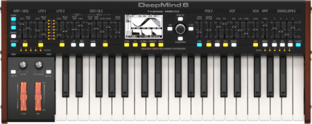 Behringer DeepMind 6 - аналоговый полифонический синтезатор, 6-голосная версия Behringer DeepMind. В остальном данная версия аналогична старшей модели, за исключением встроенного Wi-Fi-модуля - его в данной модели нет. Синтезатор оснащен полифонией в 6 голосов, на каждый голос приходится два осциллятора с цифровым управлением. Клавиатура оснащена 37 полувзвешенными клавишами с функцией послекасания и чувствительностью к нажатию. Общее количество пресетов, которое может быть в синтезаторе - 1024, в 8 банках. Также на борту синтезатора есть встроенный 32-шаговый секвенсор и арпеджиатор. Синтезатор имеет гибкую матрицу модуляции, переключаемый 2/4-полюсный Low-Pass фильтр с возможностью регулирования резонанса, High-Pass фильтр с режимом "Boost" и четыре процессора эффектов с более чем 30 алгоритмами, разработанными компаниями TC Electronic и Klark Teknik. Также есть функция отключения цепи эффектов True Bypass. На задней панели расположены разъемы Midi In/Out/Thru, USB, два 1/4" Jack аудио выхода, а также разъемы под наушники, Pedal/CV, Sustain. Данная модель идеально подойдет для работы в студии, а также для живых выступлений.