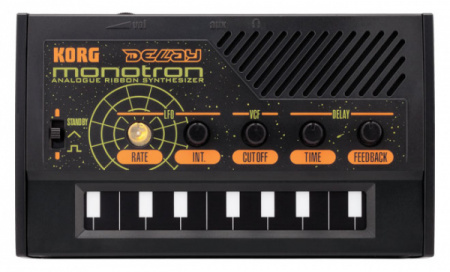 Korg Monotron Delay - компактный синтезатор с эффектом Delay. Прибор имеет классическое аналоговое звучание, которое можно использовать для обработки звука. Monotron Delay оснащен генератором низких частот, создающим прямоугольные или треугольные модулирующие волны. У прямоугольных вы сможете изменять ширину импульса, а у треугольных - плавно изменять форму. Эти параметры, так же, как и частота и степень модуляции, регулируются ручками на верхней панели синтезатора. Ручка Peak изменяет резонанс, а Cutoff меняет частоту среза. В сочетании с линией задержки это открывает широкие возможности для обработки звука. Синтезатор оснащен ленточной клавиатурой, которая расширяется до 4 октав и может бесступенчато изменять частоту звука. Также синтезатор оснащен фильтром, который использовался в легендарных моделях Korg MS-10 и MS-20. Входной разъем Aux позволяет применять фильтр для обработки любого источника звука. Модель имеет встроенный динамик и разъем для наушников. Работает от 2 батареек ААА.