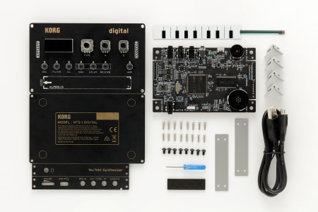 Korg Nu:Tekt NTS-1 - цифровой программируемый синтезатор на мультидвижке в формате DIY. Представляет собой набор для сборки в маленькой коробочке, напоминающей по формату синтезаторы Korg Monotron. Синтезатор оснащен цифровым осциллятором, который может генерировать пилообразные, треугольные и прямоугольные волны, а также волны переменной фазовой модуляции (VPM) и пользовательские. Модель имеет многорежимный фильтр с аналоговым моделированием, гибкие опции генерации огибающей и набор цифровых эффектов. Доступен широкий выбор фильтров: низкочастотный 2/4-полюсный, высокочастотный 2/4-полюсный, полосовой пропускной 2/4-полюсный и режим Open, все с резонансом. Три встроенных блока эффектов, включающие многочисленные реверберации, эффекты модуляции и задержки, доступны для смешивания и редактирования. Также синтезатор снабжен арпеджиатором и небольшой ленточной клавиатурой в духе Monotron. Длина паттерна арпеджиатора может быть отрегулирована от 1 до 24 шагов. При внешней синхронизации также может быть отрегулирована длительность шага - от 16 до 64 нот. Ключевая особенность данной модели заключается в том, что пользовательский режим осциллятора совместим с пользовательскими осцилляторами и эффектами Prologue и Minilogue, т.е. пользователь сможет добавлять в арсенал кастомные осцилляторы и эффекты. Устройство оснащено портами MIDI In, Sync I/O, входом Audio In и портом USB. Благодаря ленточному контроллеру, простому интерфейсу и дисплею синтезатор может использоваться интуитивно. Более глубокие изменения параметров также возможны при помощи комбинаций кнопок и ручек. В комплект входит также USB-кабель, инструкция по сборке и эксплуатации и отвертка.