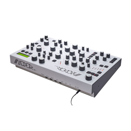 Modor NF-1 - восьмиголосный полифонический цифровой синтезатор. Благодаря продуманной системе синтеза этот инструмент воспроизводит богатое звучание от классического до экспериментального. Помимо стандартных волновых форм, осцилляторы предлагают алгоритмы аддитивного синтеза и FM-синтеза, отфильтрованный шум и генератор чип-тюна. Для обработки аудиоматериала есть не только многорежимный фильтр -12 дБ, но и формантный фильтр с функцией морфинга. Секция эффектов включает в себя задержку и фленджер/хорус. Отдел модуляции очень гибкий благодаря матрице маршрутизации. NF-1 оснащен тремя идентичными осцилляторами, источником белого шума и кольцевым модулятором (Osc 2 x Osc 3). Микшер позволяет пользователям комбинировать все сигналы, генерируемые синтезатором. Осцилляторы имеют общий набор элементов управления. Это не только экономично, но и удобно, так как такая компоновка позволяет редактировать отдельные аудиогенераторы или сразу несколько. В частности, есть потенциометры грубой и точной настройки, а также ручки для установки интенсивности модуляции LFO и огибающей. Доступны десять волновых форм соответственно алгоритмов синтеза. Функциональность потенциометров Mod отличается от алгоритма к алгоритму. NF-1 оснащен двумя совершенно разными фильтрами, которые можно подключать параллельно или последовательно. NF-1 оснащен двумя генераторами эффектов, хорусом/фленджером и задержкой, как с отдельными элементами управления, так и с ручками Dry/Wet. Отдел модуляции состоит из трех LFO, генератора выборки и удержания и четырех огибающих, подобных ADSR, с некоторыми дополнительными функциями. Существует матрица для выполнения других соединений между источниками модуляции и целями. Можно сохранить несколько сотен звуков. Все параметры доступны не только на устройстве, но и могут управляться через MIDI.