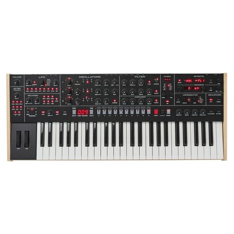 Sequential Trigon 6 Keyboard - 6-голосный полифонический аналоговый синтезатор с тремя дискретными VCO на голос. Формы волны: треугольная, пилообразная, инвертированная пилообразная и импульс с изменяемой шириной. Встроенный фильтр с огибающей и переключаемой двух- и четырехполюсной конфигурацией с фидбеком. Синтезатор оснащен цифровыми эффектами (реверб, задержка, хорус, фленджер, фазер, ринг-модулятор), а также аналоговым стереодисторшном. Для работы с ритмом и мелодикой в Trigon-6 предусмотрены арпеджиатор, полифонический секвенсор на 64 шага и 49 полувзвешенная клавиша с velocity и aftertouch. За модуляцию отвечает LFO с аттенюацией и 8 параметрами назначения. Синтезатор поставляется с 500 заводскими пресетами и 500 пользовательскими слотами. Синтезатор поддерживает подключения по MIDI и USB. Для подключения педали экспрессии и педали сустейна предусмотрен отдельный вход 6,3 мм джек.