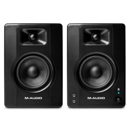 M-Audio BX4 BT - пара мультимедийных двухполосных контрольных мониторов c Bluetooth. Они могут использоваться для контроля звука на прямых трансляциях, для музыкального производства, для подкастинга и работы с постпродакшном, их можно использовать в студиях звукозаписи, прожект-студиях и дома, а также в образовательных учреждениях. Один из мониторов является активным, имеющим встроенный усилитель, а другой пассивным. Общая выходная мощность составляет 120 Вт в пике. Каждый громкоговоритель оснащен низкочастотным драйвером диаметром 4,5 дюймов, а также шелковым 1-дюймовым твитером. Мониторы обеспечивают профессиональное звучание, имеют компактный корпус и привлекательный внешний вид. Благодаря встроенному Bluetooth-приемнику можно транслировать звук с любого устройства, имеющего поддержку передачи аудиосигнала по Bluetooth, будь то смартфон, плеер, компьютер или планшет. Радиус приема Bluetooth-сигнала составляет 30,5 метров. Двухполосная конструкция громкоговорителей отличается акустически инертным корпусом с фазоинвертором. Сам корпус изготовлен из МДФ, низкочастотные динамики изготовлены из кевлара, что обеспечивает четкую передачу в этой частотной области. Любая песня, фильм или видеоигра звучат максимально насыщенно и реалистично на этой системе. Обеспечивается работа в диапазоне частот от 69 Гц до 22 кГц. На передней части активного монитора находится удобный регулятор уровня громкости, LED-индикатор активного сопряжения Bluetooth, стереовыход для наушников 1/8" Jack TRS и стереовход AUX 1/8" Jack TRS. На задней части активного монитора находятся 2 балансных входа 1/4" Jack TRS, которые объединены с небалансными входами 2 x RCA. Под ними находится выходной разъем 1/8" Jack TRS для подключения к пассивному монитору. Мониторы оснащены регуляторами уровня громкости низких и высоких частот, с помощью которых можно настроить звучание всей системы под свои предпочтения. Также рядом находится переключатель позиционирования громкоговорителей - левый или правый. M-Audio BX4 BT поставляется в комплекте с цифровой рабочей станцией MPC Beats, которая позволяет легко создавать профессионально звучащие подкасты, музыку или биты на любом компьютере с системами Windows или MacOS.