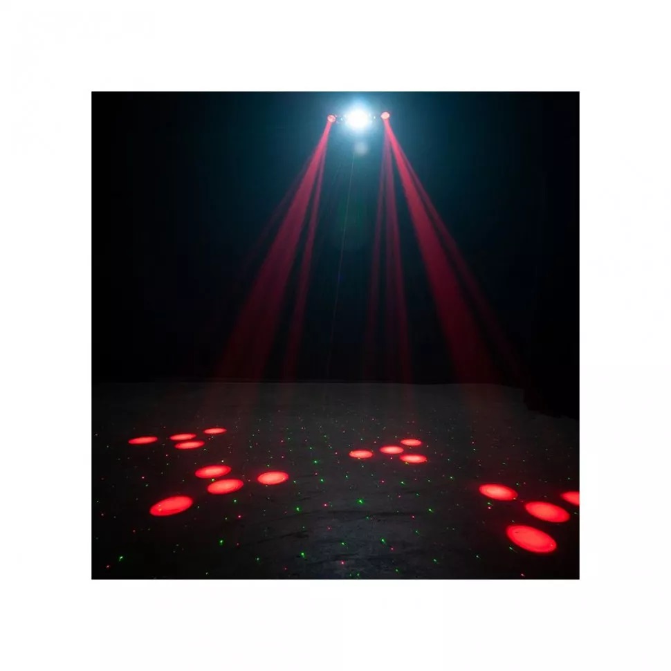 ADJ Furious Five RG - это многофункциональный световой прибор, сочетающий в себе 5 эффектов. Это уникальное устройство, отлично подходящее для передвижных площадок, а также для работы в барах и клубах с ограниченным пространством, создает полноценное световое шоу с использованием дерби и лазерных лучей, УФ-излучения и цветной заливки, а также стробоскопических эффектов. В самом центре светильника находится лазерная апертура, которая проецирует бесчисленное количество дифрагированных лучей, генерируемых двумя лазерными диодами (70 мВт зеленого и 100 мВт красного). Вокруг апертуры размещены 81 белых светодиодов SMD 5730, которые формируют стробоскопический эффект с регулируемой скоростью. С каждой стороны прибора расположены 6 светодиодов 4-в-1 мощностью 3 Вт (красный, зеленый, синий, белый), которые создают яркие цветовые оттенки, а также 4 УФ-светодиода CREE мощностью 3 Вт. Наконец, по обе стороны светильника расположены две линзы-дерби, каждая из которых использует 8 красных, 6 зеленых, 6 синих и 6 белых светодиодов для проецирования анимированных точечных рисунков и создания захватывающих эффектов в пространстве.
