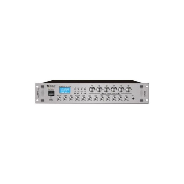 M1080 - трансляционный микшер-усилитель с MP-3 плеером и функцией тюнера FM. - Мощность 80 Вт. - 6 зон с раздельной регулировкой уровня. - Режим работы - 70/100 В, 8 Ом. - Поддержка MP-3 и WMA формата. - Тюнер FM. - Функция перезвона и сирен - 2 AUX -входа, 3 MIC -входа, 1 AUX-выход - Функция приоритета на MIC1. - LED дисплей с индикацией. - Индивидуальный контроль для микрофонного и AUX входов. - Регулировка тембров. - Питание 220 В/50 Гц. - Потребляемая мощность - 120 Вт - Вес -11 кг. - Габариты 482 х 410 х 88 мм.