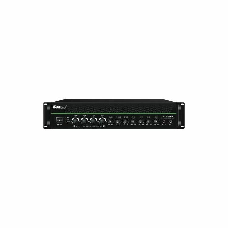 NT080 - Трансляционный 4-х зонный усилитель мощностью 80 Вт. - Индивидуальное подключение зон с регулировкой уровня - Индивидуальная регулировка входного уровня на каждом входе. - Регулировка общего выходного уровня ( master ) - Эквализация 2 полосы. - 2 микрофонных входа ( 1,4" Jack ) - 2 линейных входа ( RCA ) - 1 линейный выход ( RCA ) - Функция приглушения ( muting ) - 6 степеней защиты. - Принудительное охлаждение. - Цвет: черный. СПЕЦИФИКАЦИЯ Номинальная выходная мощность 80 Вт Частотный диапазон 100 - 16 кГц Выход на АС 70/100 В, 4-16 Ом Потребляемая мощность 120 Вт Размер 2U Габариты 487 х 380 х 90 мм Вес 8,5 кг