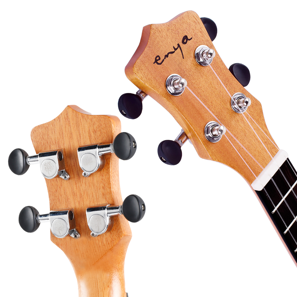 Enya EUC-25D - укулеле в корпусе размера концерт из африканского красного дерева с чехлом в комплекте. Модель имеет традиционный внешний вид за счет натурального рисунка дерева по всему корпусу, а также обладает мягким и музыкальным тембром. Весь корпус, включая топ, нижнюю деку и обечайку, выполнен из древесины африканского красного дерева. Гриф также выполнен из красного дерева, а бридж и накладка изготовлены из искусственного черного дерева (Tech-Ebony). Оно имеет повышенную стабильность, прочность и устойчивость к таким факторам, как прямое попадание влаги, высокую или низкую температуру, а также повышенную влажность воздуха. Нижний и верхний порожки сделаны их кости. На грифе имеется 18 ладов с инкрустацией в виде белых звезд. На голове грифа располагаются открытые литые колки. Наличие стреплоков позволяет использовать стандартный гитарный ремень. На гитару установлены фирменные струны Enya. Комплект поставки включает в себя мягкий чехол на молнии.