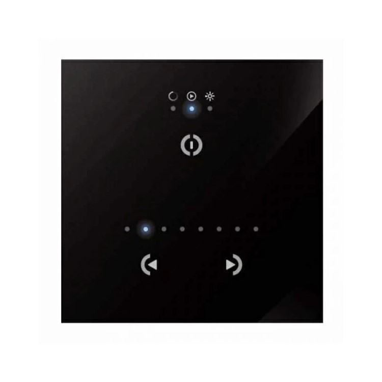 Sunlite Stick-GU2 - настенный сенсорный программируемый DMX-контроллер для архитектурного освещения. Контроллер идет в комплекте со встроенными RGB программами, также дополнительно можно перепрограммировать сценарии с помощью программы Easy Stand Alone. Контроллер обеспечивает 128 DMX каналов, 24 сцены и 1 зону. Устройство имеет 3 сенсорных кнопки для простоты управления. Динамические сцены создаются шаг за шагом с регулировкой времени проигрывания. Доступна установка яркости и цвета проигрываемой сцены и возможность программировать с помощью программ для компьютера. На задней панели расположен блок коннекторов: 3 х DMX, 2 x питание.